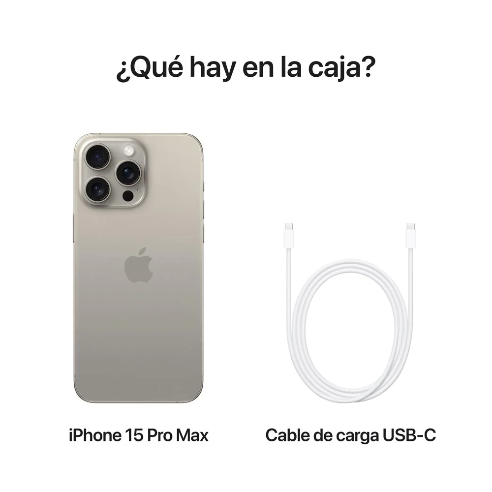 Contenido de la caja: iPhone 15 PRO MAX – Cable de carga USB-C (1 m) – Documentación.