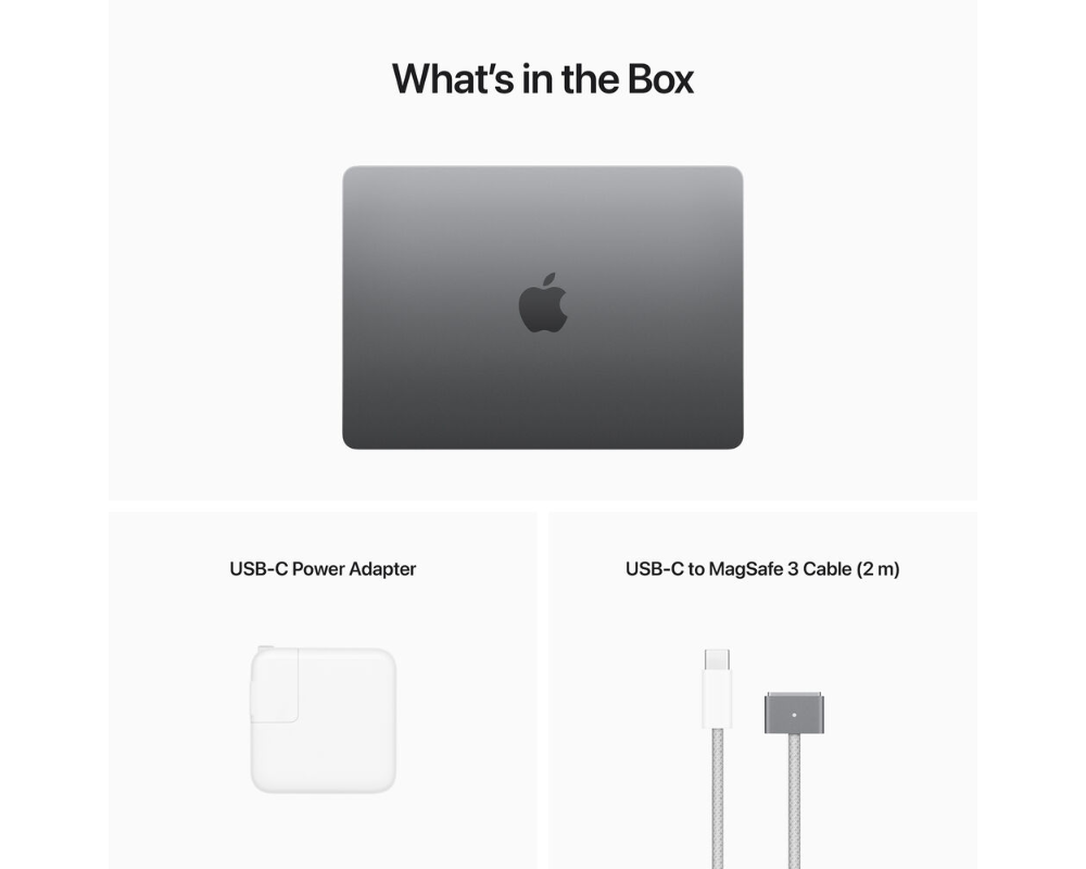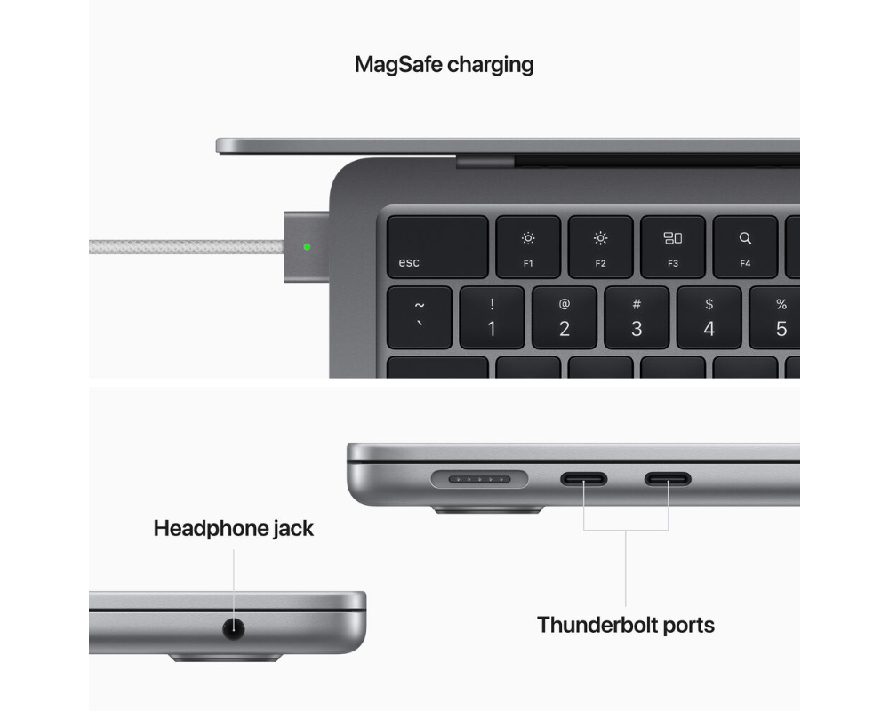 - Puertos: 1x Puerto Jack (Auriculares) – 2x USB-C Thunderbolt/USB – 1x Magsafe 3