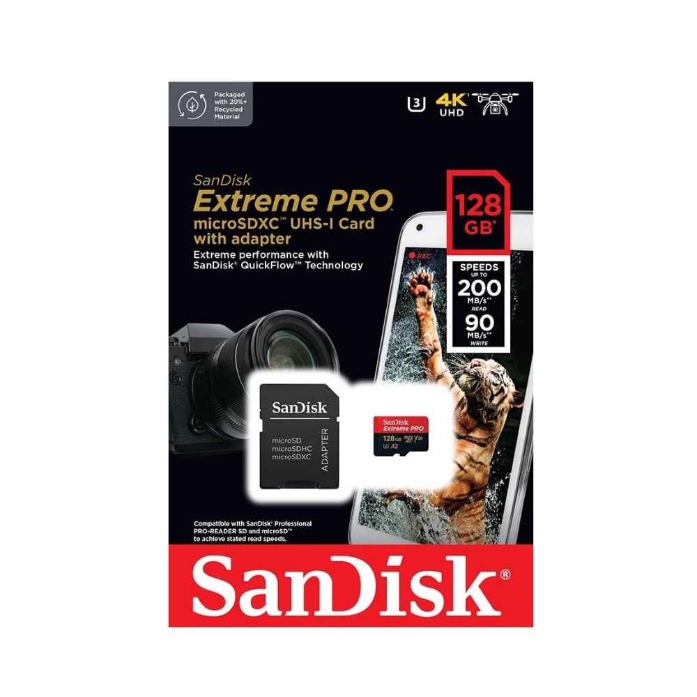 SanDisk Extreme Pro SDSQXCD-128G-GN6MA obtén velocidades extremas con una tarjeta de memoria microSDXC™ para una transferencia rápida, mejor rendimiento de aplicaciones y 4K UHD. Ideal para tu teléfono inteligente Android™, cámaras de acción o drones, esta tarjeta microSD SDXC Extreme Pro de alto rendimiento graba videos 4K UHD, videos Full HD y fotos de alta resolución.