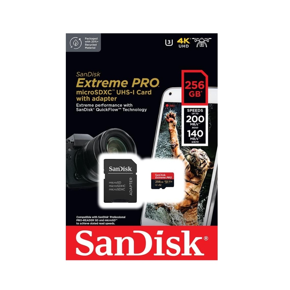SanDisk Extreme Pro SDSQXCD-256G-GN6MA obtén velocidades extremas con una tarjeta de memoria microSDXC™ para una transferencia rápida, mejor rendimiento de aplicaciones y 4K UHD. Ideal para tu teléfono inteligente Android™, cámaras de acción o drones, esta tarjeta microSD SDXC Extreme Pro de alto rendimiento graba videos 4K UHD, videos Full HD y fotos de alta resolución.