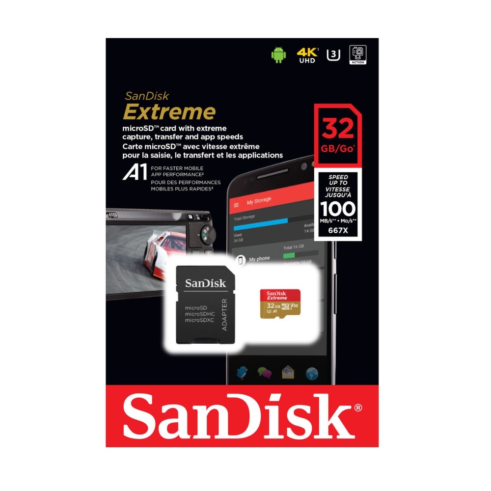 SanDisk Extreme SDSQXAF-032G-GN6AA es una tarjeta microSD™ UHS-I que te proporciona la libertad para capturar, guardar y compartir, gracias a su capacidad de hasta 32 GB para almacenar más horas de vídeo en alta definición y ofrecen unas velocidades de lectura secuencial de hasta 100 MB/s para que puedas ver contenido rápidamente.