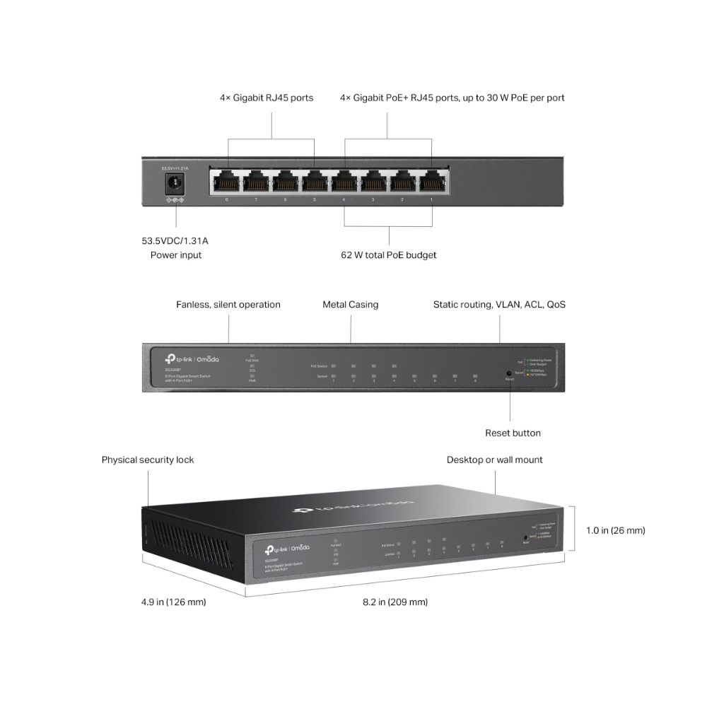 Este conmutador gestionable cuenta con ocho puertos Gigabit Ethernet, cuatro de los cuales son compatibles con PoE+. Cada puerto PoE admite hasta 30 W de potencia, con un presupuesto de energía total de 62 W para operar dispositivos compatibles como cámaras de seguridad IP, teléfonos VoIP y puntos de acceso inalámbricos.